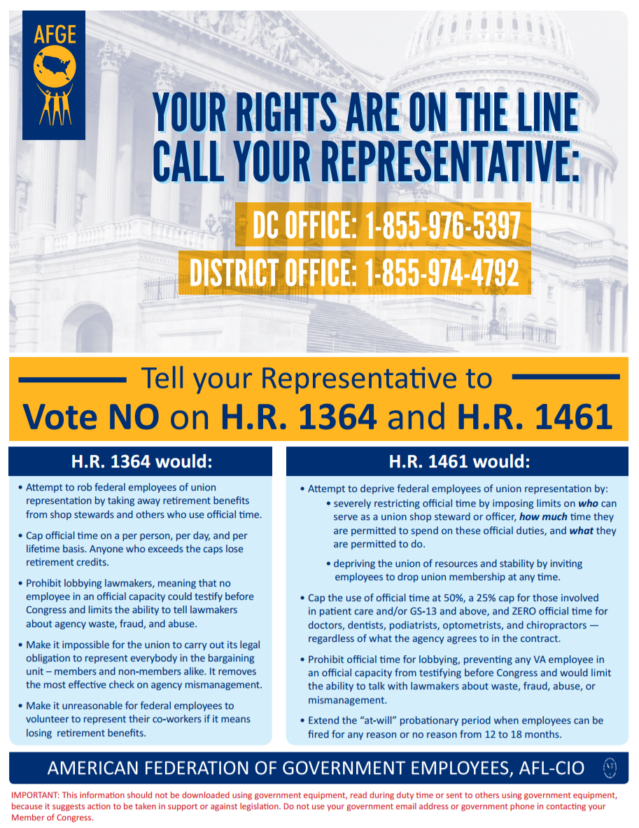 Here’s a script to use: “Hello, my name is _____, and I’m a member of the American Federation of Government Employees from [Your City, State]. Please tell the Representative to vote NO on H.R. 1364, and vote NO on H.R. 1461. These bills do nothing to improve government. They simply attack my rights at work and my ability to provide quality service for the people I’m proud to serve. Thank you.”